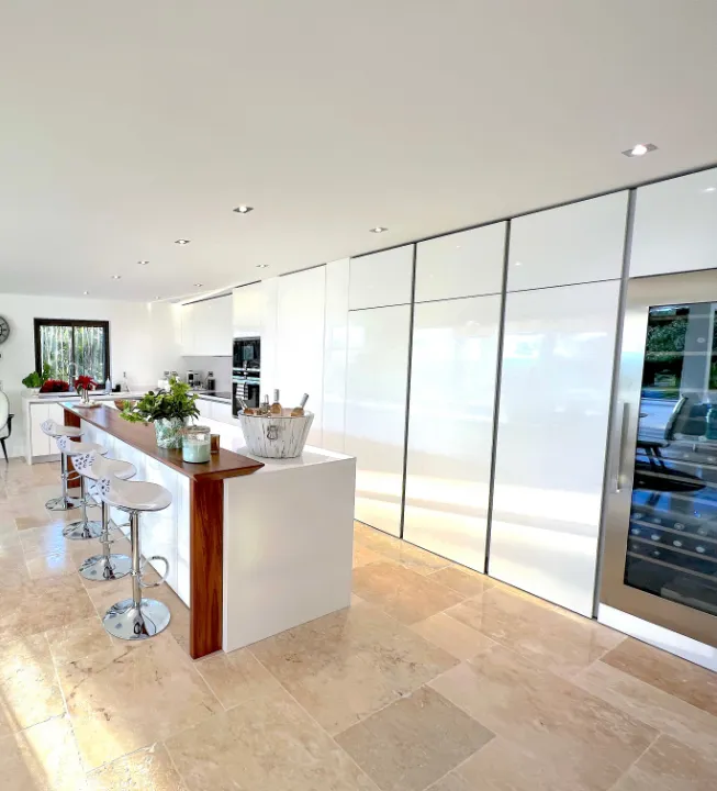 La cuisine spacieuse, moderne et entièrement équipée — avec arrière-cuisine et chambre froide — est pensée pour sublimer les instants gourmands. Elle complète parfaitement l’expérience d’une location de villa haut de gamme proche de Sainte Maxime, où la gastronomie se vit dans un cadre élégant.